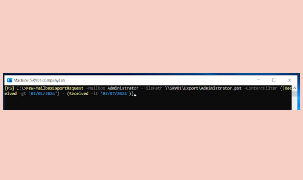 New-MailboxExportRequest -ContentFilter {(Received -gt ‘<01/01/2024>’) – (Received -lt ‘<07/07/2024>’) } -Mailbox <user to export> -Filepath <network path destination>